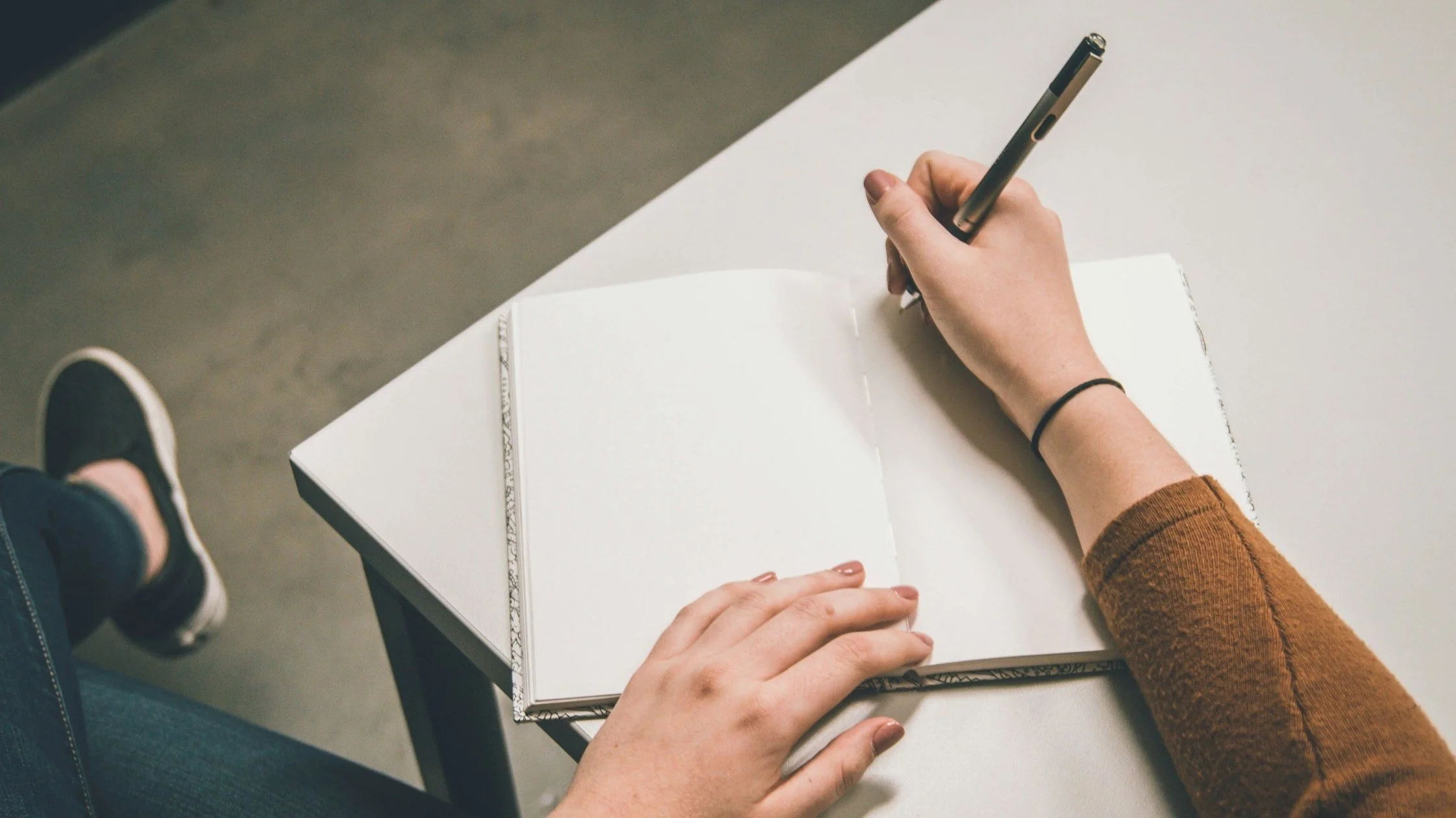 A woman sits at a desk and uses a pen to write a Christian testimony.