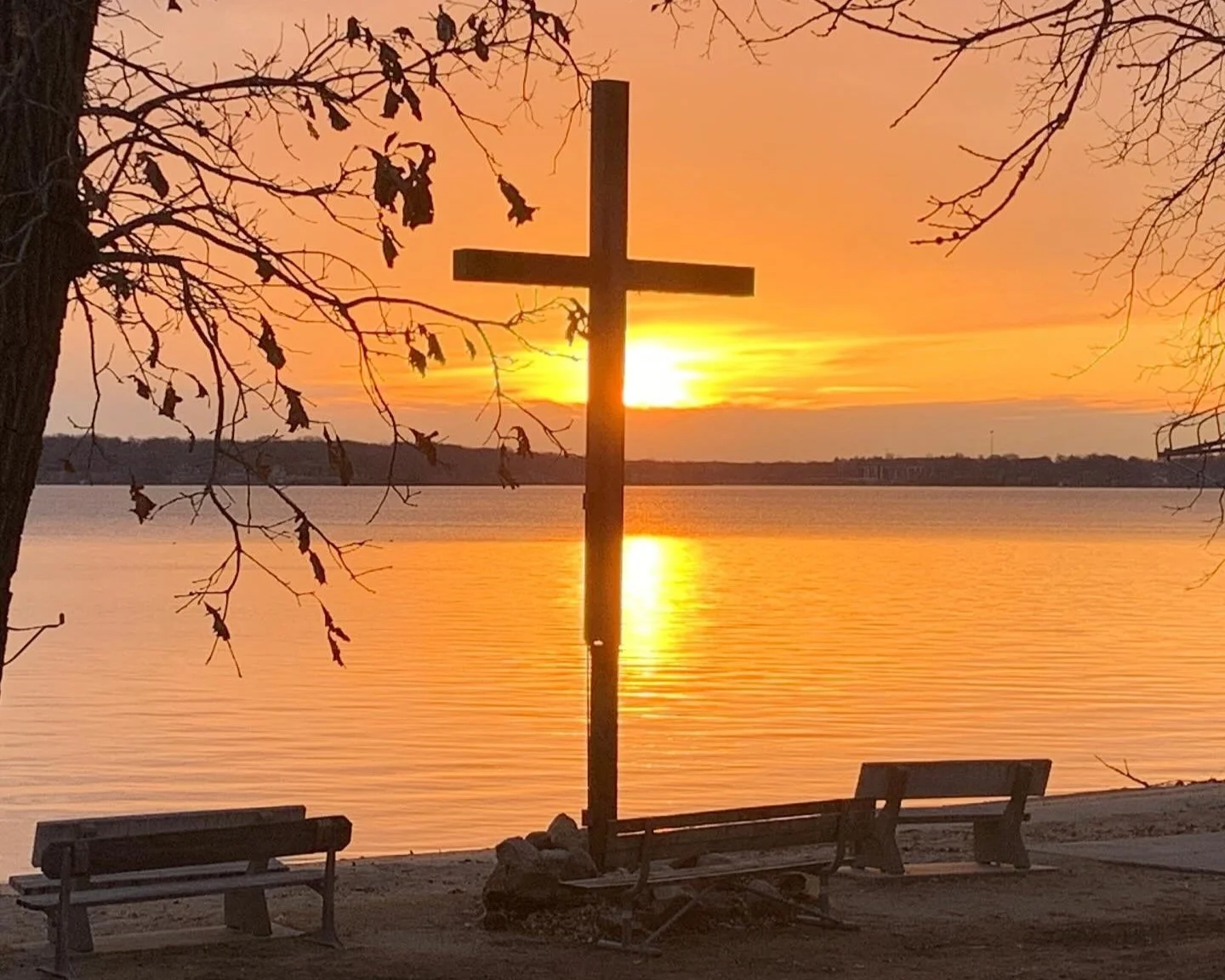 The sunset is reflected on a cross at Okoboji Lutheran Bible Camp in Iowa, where Dawn’s prayer for a miracle was heard.